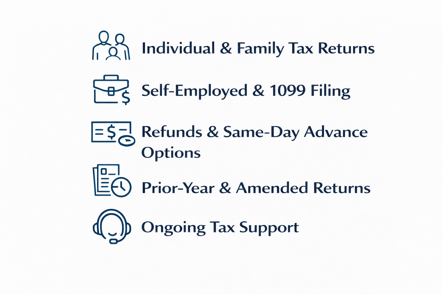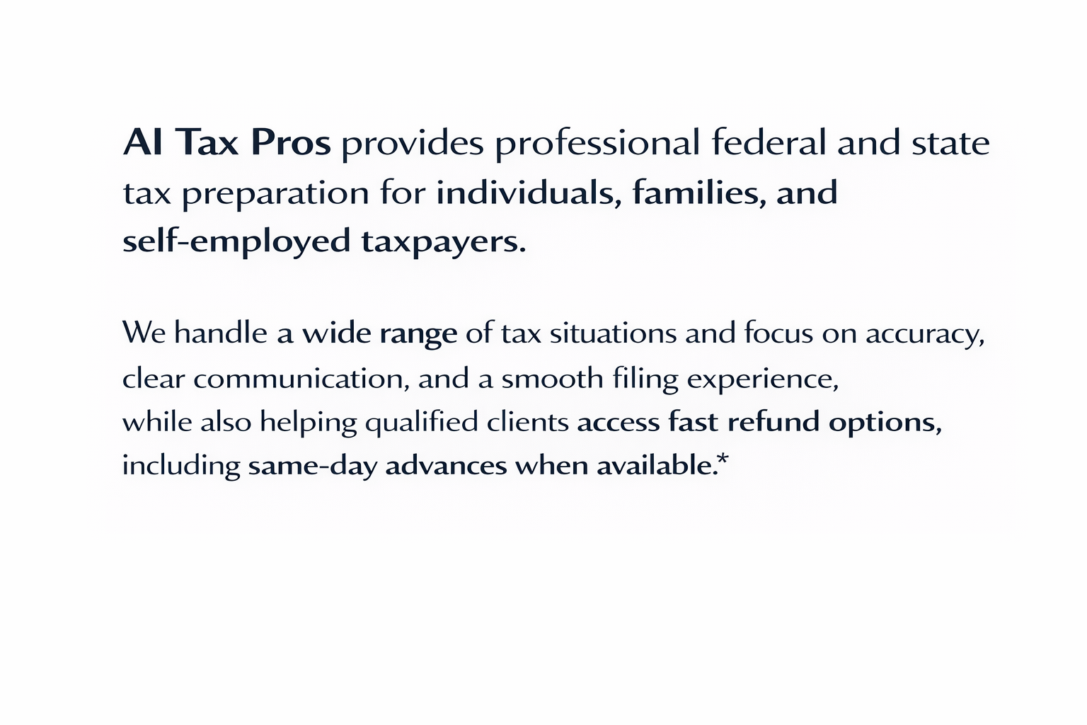 AI Tax Pros works with individuals, families, and self-employed taxpayers across a wide range of income types and filing situations. Whether your return is straightforward or needs extra attention, we’re here to guide you through the process and make sure everything is handled correctly.
